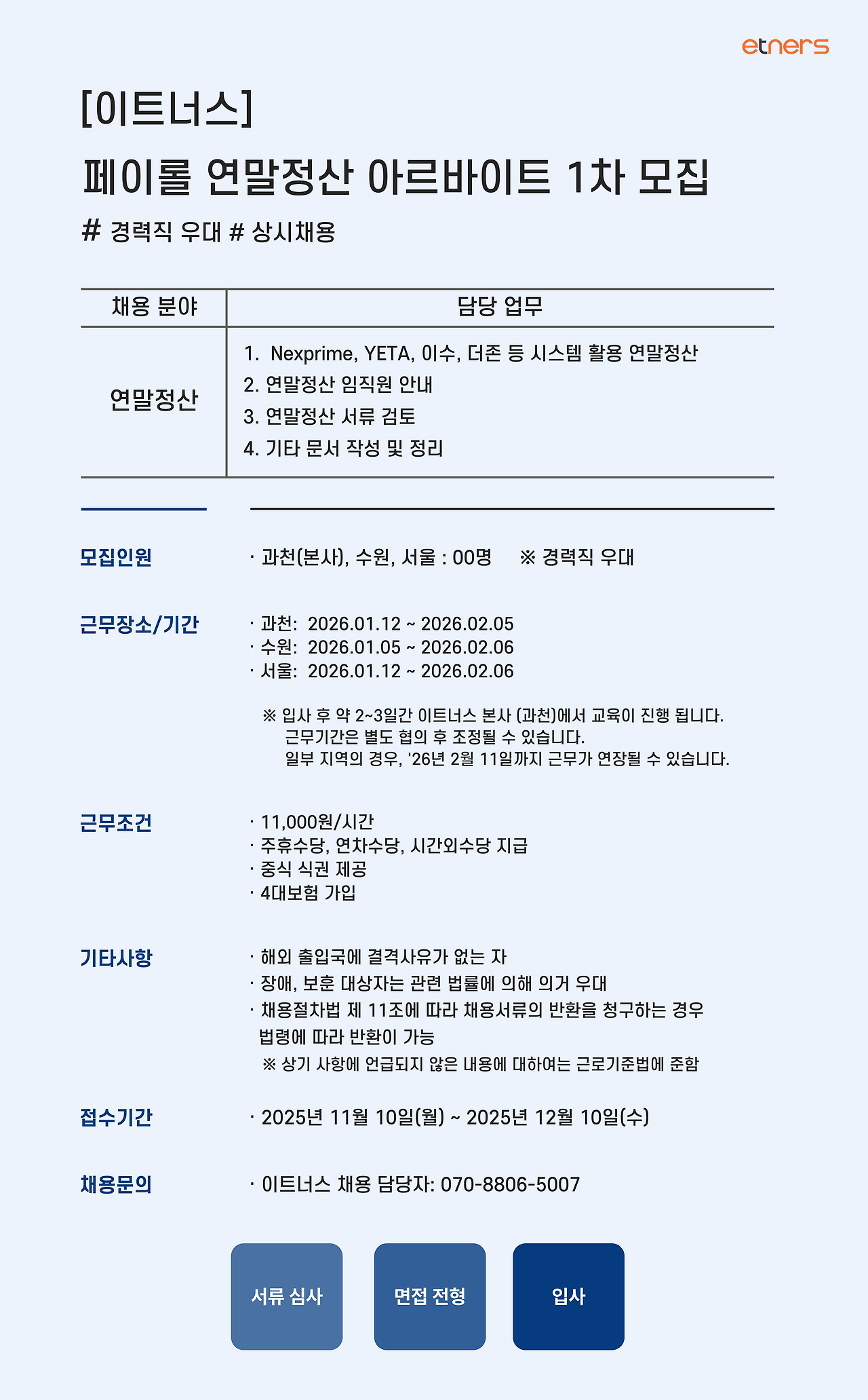 ⑧ 지원 방법: 이트너스 채용사이트 (https://welcome.etners.com/) - 2025년 페이롤 연말정산 아르바이트 1차 모집 공고