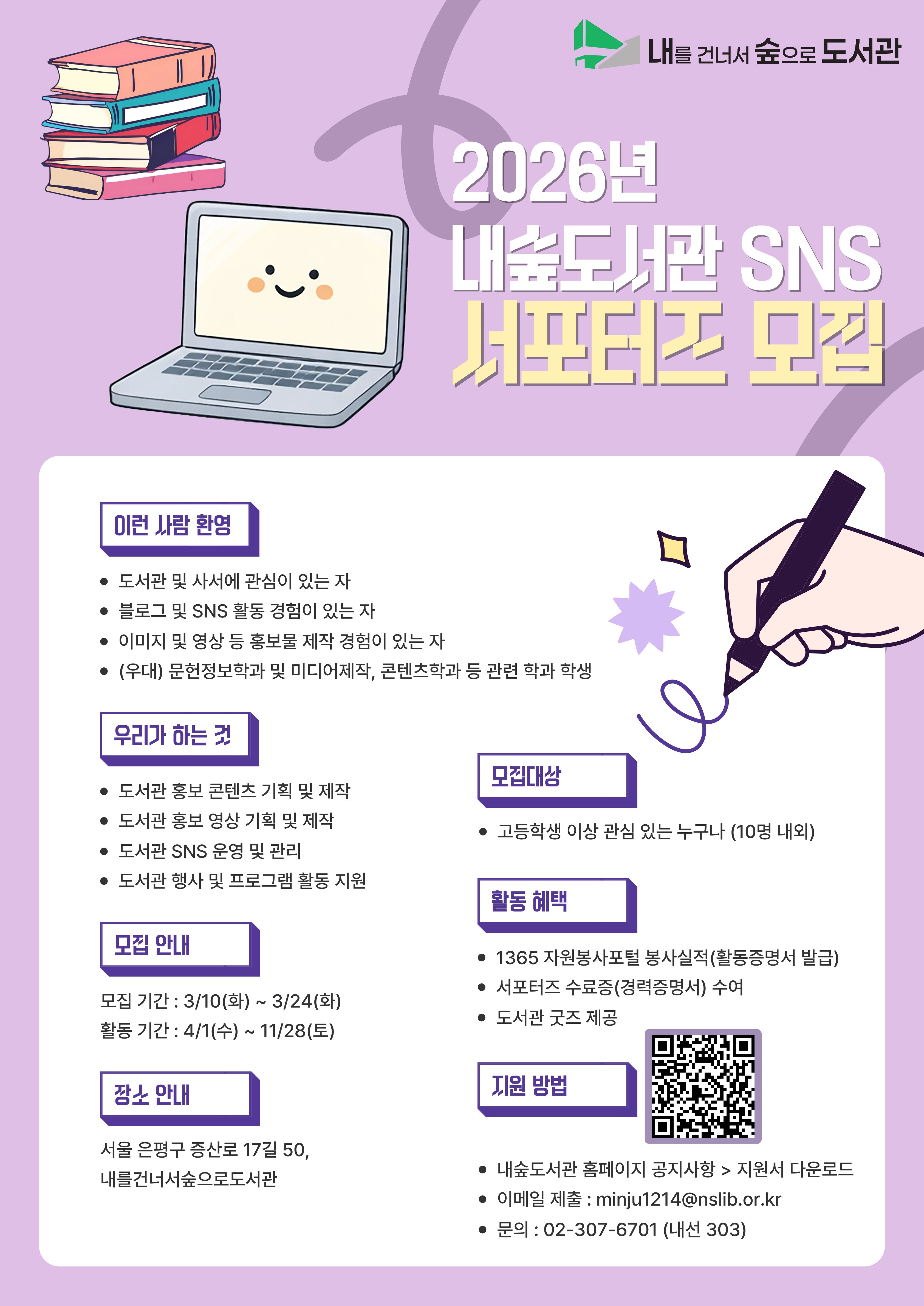 2026년 내를건너서숲으로도서관 SNS서포터즈 모집 안내
