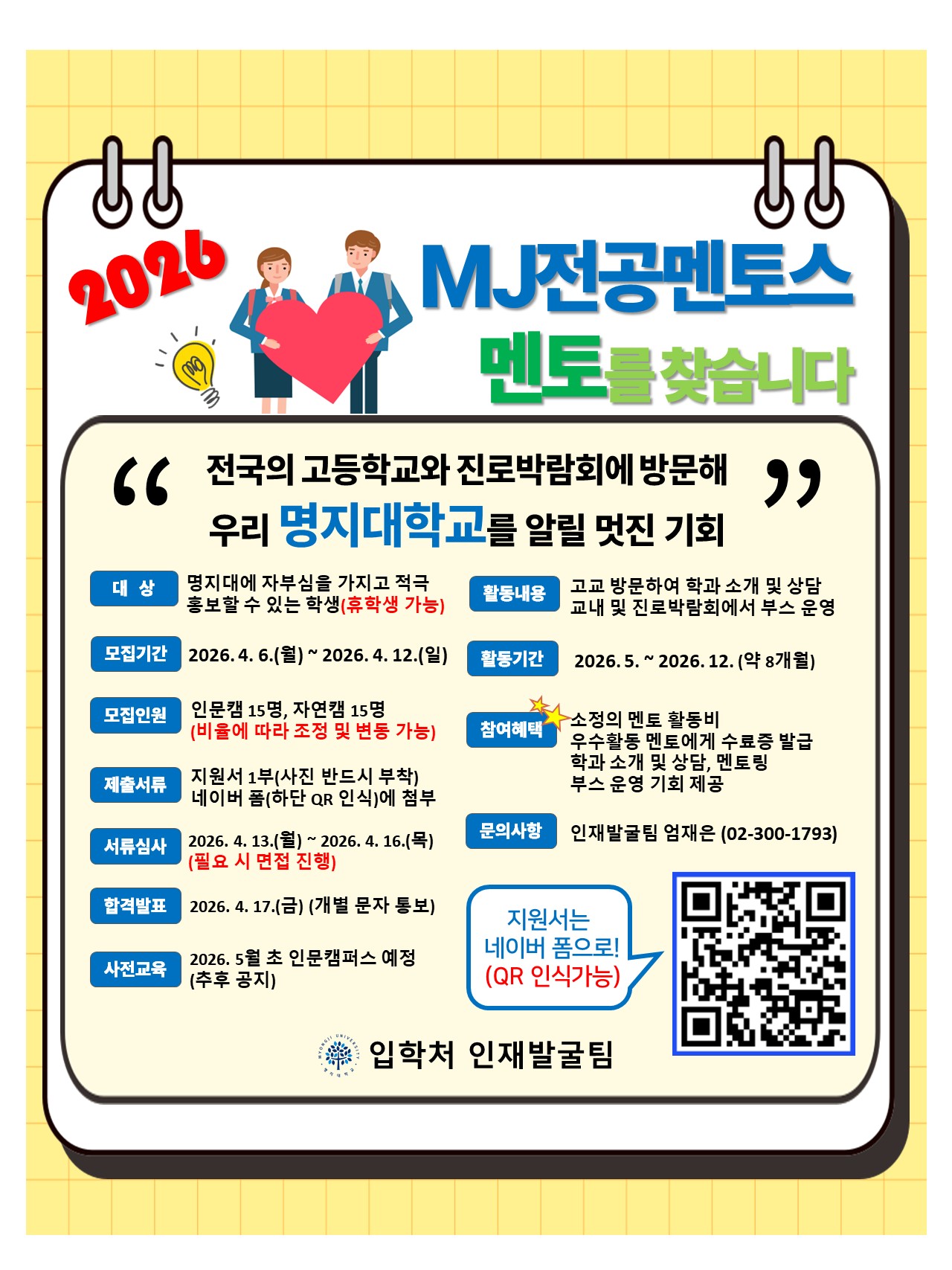 명지대학교 입학처 인재발굴팀에서 '2026 MJ전공멘토스' 멘토를 모집합니다.